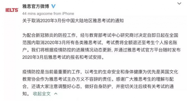 雅思官方微博发布“关于取消2020年3月份中国大陆地区雅思考试的通知”。