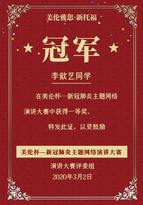 美伦杯—新冠肺炎主题网络演讲大赛:冠军公布
