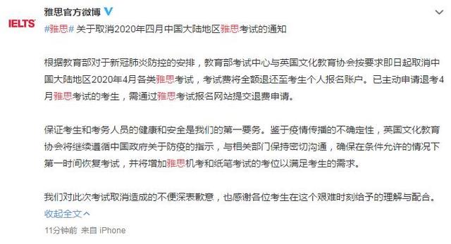 根据教育部对于新冠肺炎防控的安排,教育部考试中心与英国文化教育协会按要求即日起取消中国大陆地区2020年4月各类雅思考试,考试费将全额退还至考生个人报名账户。已主动申请退考4月雅思考试的考生,需通过雅思考试报名网站提交退费申请。 保证考生和考务人员的健康和安全是我们的第一要务。鉴于疫情传播的不确定性,英国文化教育协会将继续遵循中国政府关于防疫的指示,与相关部门保持密切沟通,确保在条件允许的情况下第一时间恢复考试,并将增加雅思机考和纸笔考试的考位以满足考生的需求。 我们对此次考试取消造成的不便深表歉意,也感谢各位考生在这个艰难时刻给予的理解与配合。