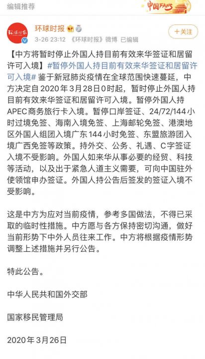 国家移民管理局发布消息:受疫情影响,3月28日起,暂停外国人持来华签证或居留许可入境,也就是说除了特殊情况,外国人无法入境。