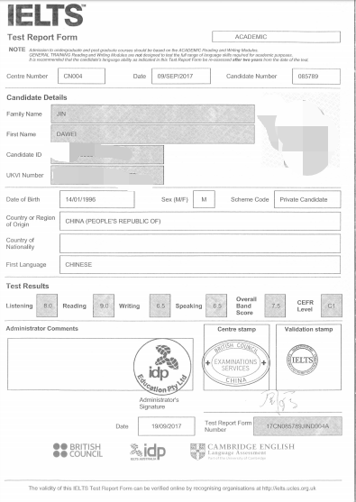 我是扬州美伦雅思培训班的学员靳大伟,经过大三暑假的学习,我很幸运的在2017年9月9日的雅思考试中取得了总分7.5的成绩。