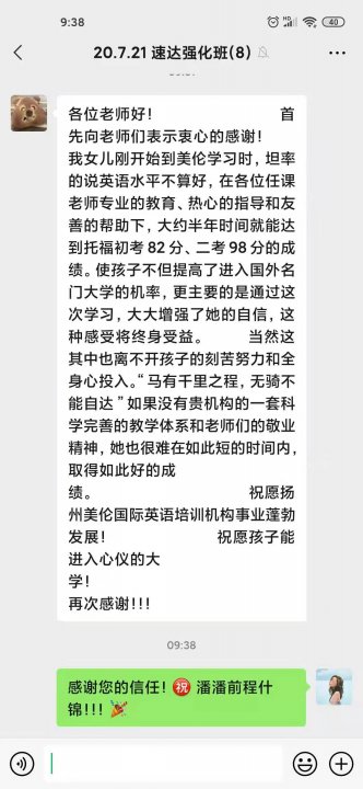 在学习托福时,不可避免的是其难度是很大的,一定要先树立信心,相信自己可以通过一步步努力而获得最终的成功。其次要跟着老师的节奏走,所有老师都是经过严格训练并且有充分的经验的,相信他们无疑是非常有必要的,美伦的老师都很有责任感,每天会要求在群里打卡自己的作业完成度,让人很有安全感并且有种踏实的感觉。她们会按照个人的情况来安排课程与内容,按照学习进度给学生制定新的计划,全心全意帮助学生提高成绩。一旦遇到什么学习上的疑问,发私信给她们,她们总会在第一时间帮助我解决问题,并且给我提一些相关的建议,让我能够不断提升和进步,并且发现自己的不足然后改正。